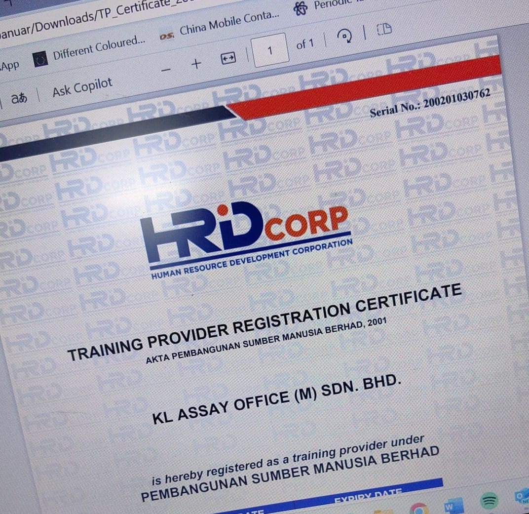 KL Assay Office (M) Sdn Bhd offers specialized training services designed to enhance industry knowledge and technical skills in precious metal analysis, hallmarking standards, and assay procedures. As a trusted authority in the field, we provide hands-on training and certification programs tailored for professionals in the jewelry, refining, and metal trading industries. Our courses cover topics such as gold purity testing, XRF machine operation, quality assurance, and regulatory compliance, ensuring your team is equipped with up-to-date expertise and practical know-how. Conducted by experienced industry practitioners, our training is ideal for companies looking to improve accuracy, integrity, and efficiency in precious metal evaluation and handling.